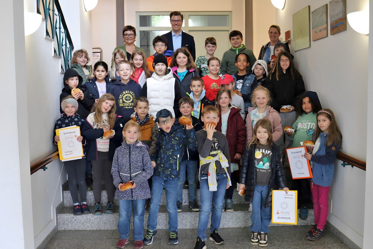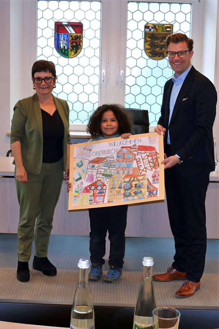 Dieser Tage war der Schülerrat der Johann-Wölfflin-Schule gemeinsam mit Rektorin Eva Woelki und Schulsozialarbeiterin Ann Kathrin Geiler im Rathaus zu Gast. Die 28 Mädchen und Jungen, allesamt Klassensprecherinnen und Klassensprecher der vier Jahrgangsstufen der Grundschule, hatten sich im Vorfeld gut auf das Gespräch mit Oberbürgermeister Gregor Bühler vorbereitet und nutzten die Gelegenheit, das Stadtoberhaupt mit Fragen zu "löchern". Dabei standen allgemeine Fragen wie "Wie wird man Oberbürgermeister?", "Was macht ein Oberbürgermeister?" ebenso im Interesse der jungen Besucherinnen und Besucher wie persönliche Fragen "Was nervt Sie manchmal?" oder "Was ist ihr Lieblingsfußballer?". Am Ende des knapp einstündigen Besuchs verabschiedeten sich die Kinder mit dem neu erworbenen Wissen über den Ablauf einer OB-Wahl und eines normalen Arbeitstags im Leben des Oberbürgermeisters, erfuhren aber auch, dass Christian Günter vom SC Freiburg der Lieblingsfußballer von Gregor Bühler ist und ihn nervt, wenn man "übereinander statt miteinander" spricht. Bevor die Schülerräte den Rückweg in die Johan-Wölfflin-Schule antraten, überreichten sie Oberbürgermeister Bühler noch ein Geschenk: Ein selbstgemaltes Stadtportrait Oberkirchs, das die Fachwerkhäuser der Stadt von ihrer schönsten Seite zeigt.