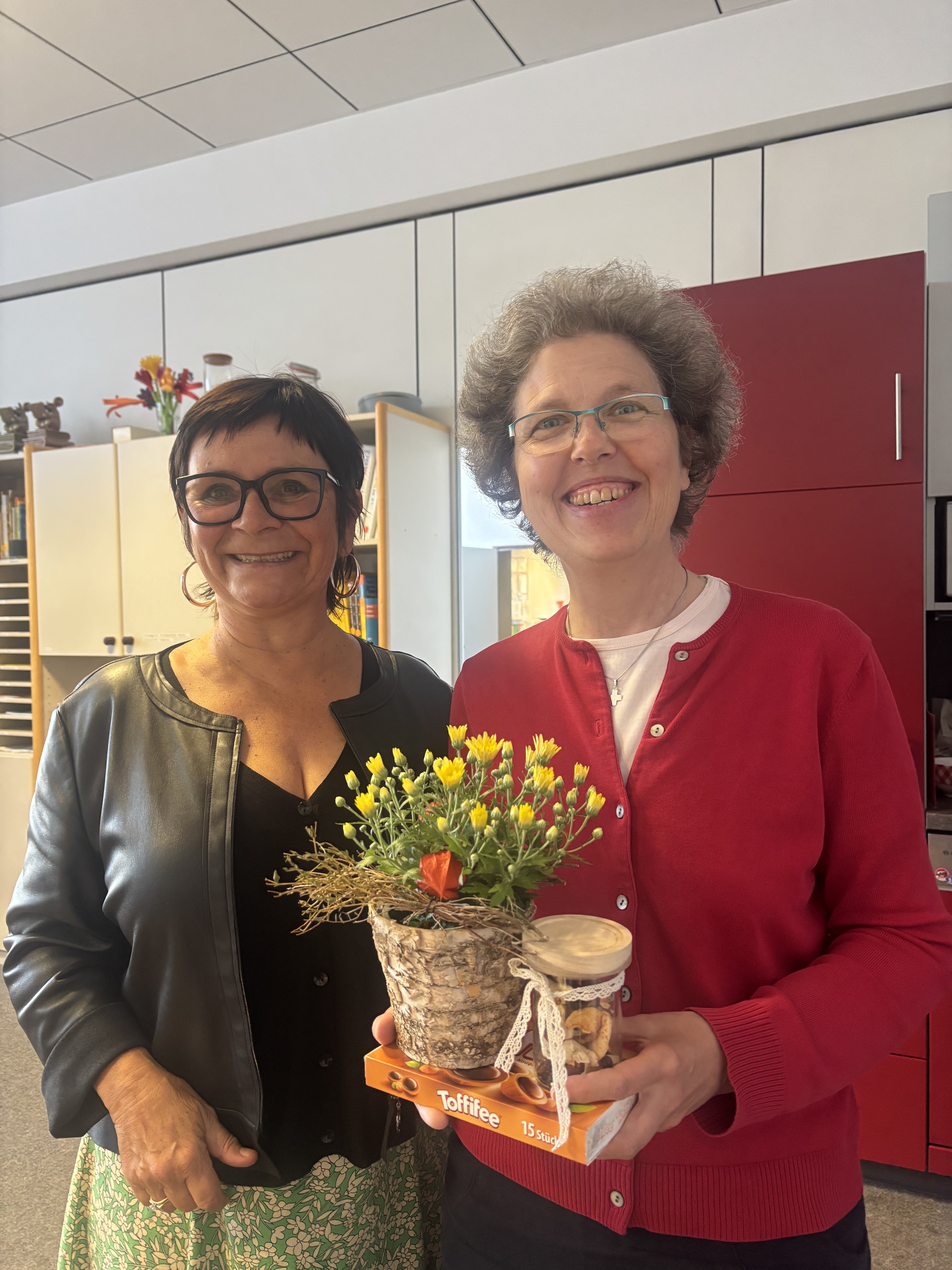In einer kleinen Feierstunde würdigte das Kollegium die Verdienste der Jubilarin. Frau Woelki überreichte ein kleines Geschenk und sie bedankte sich für die vertrauensvolle Zusammenarbeit.