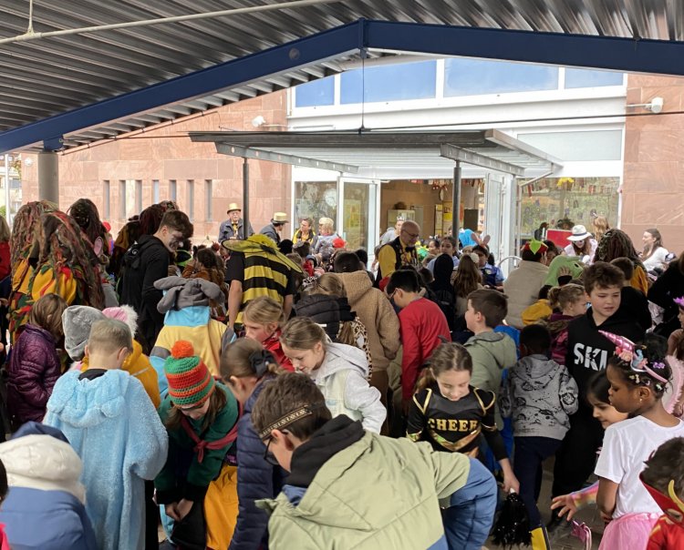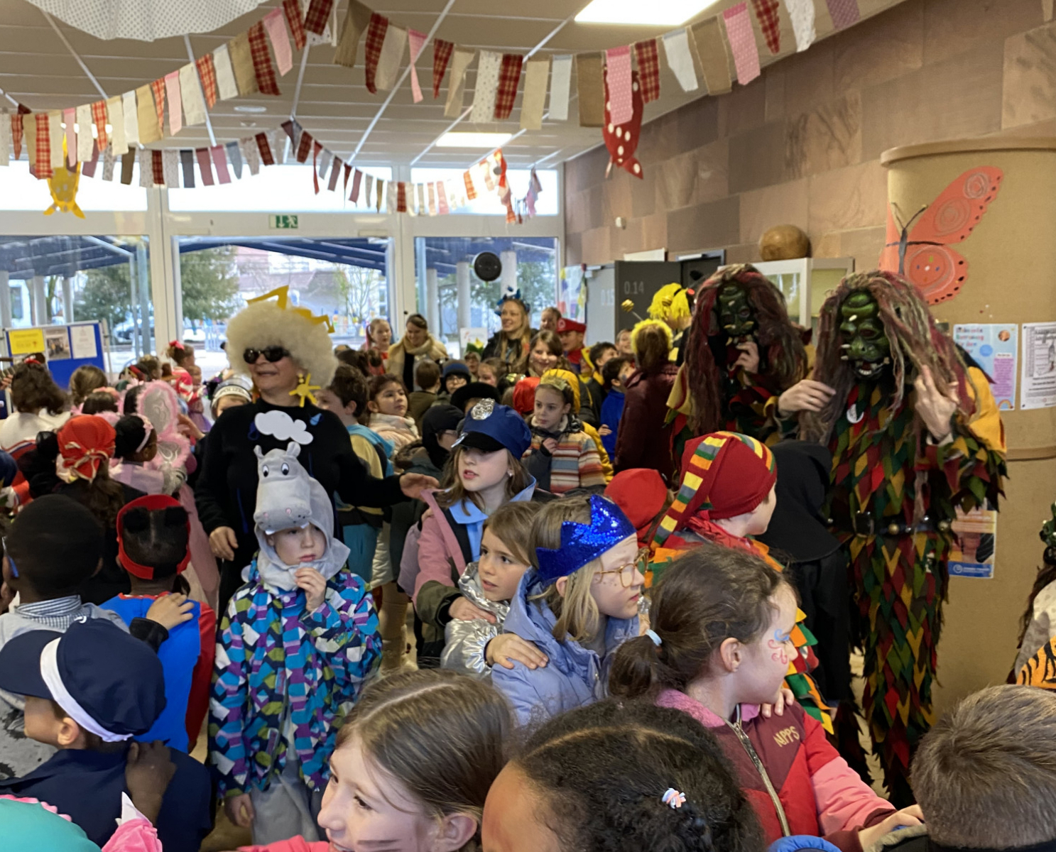 Kaum hatte ich mich vom Polonaise-Schock erholt, wurde es richtig trubelig. Die Notire und Leimener sind in unsere Schule eingefallen! Für eine kleine Ameise wie mich sehen die Notire mit ihren Masken ziemlich gefährlich aus. Aber wisst ihr was? Unter dem ganzen Häs scheinen sie eigentlich ganz friedlich zu sein. Und vor den Leimenern braucht man sowieso keine Angst zu haben. Die beiden Gruppen haben die Fastnachtstradition direkt zu uns in die Schule gebracht, echt cool! Nachdem wir gemeinsam das Leimener Lied gesungen hatten, flogen auch schon die ersten Bonbons. Die Kinder sammelten sie so schnell ein, dass mir gar nix übrig blieb.