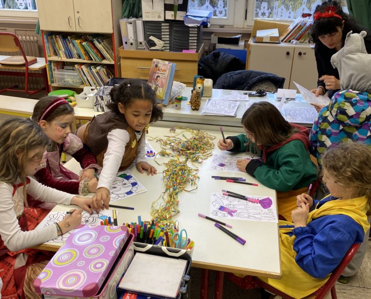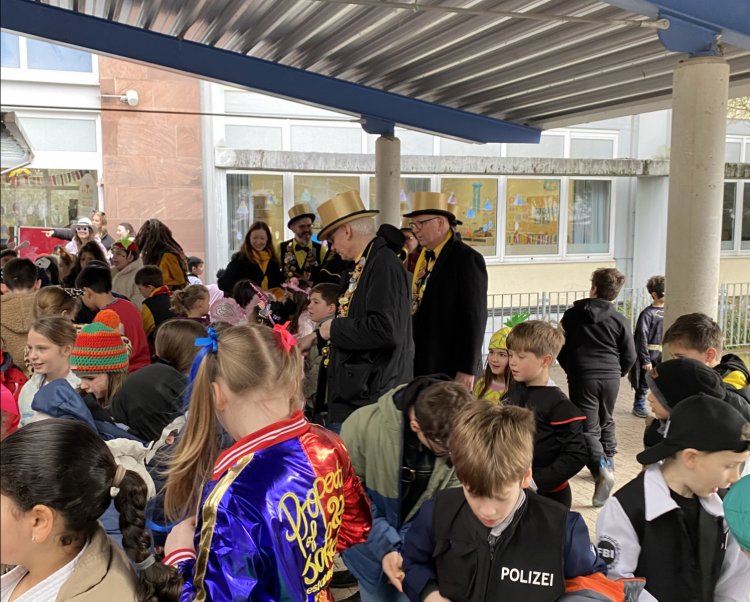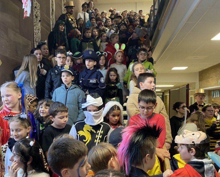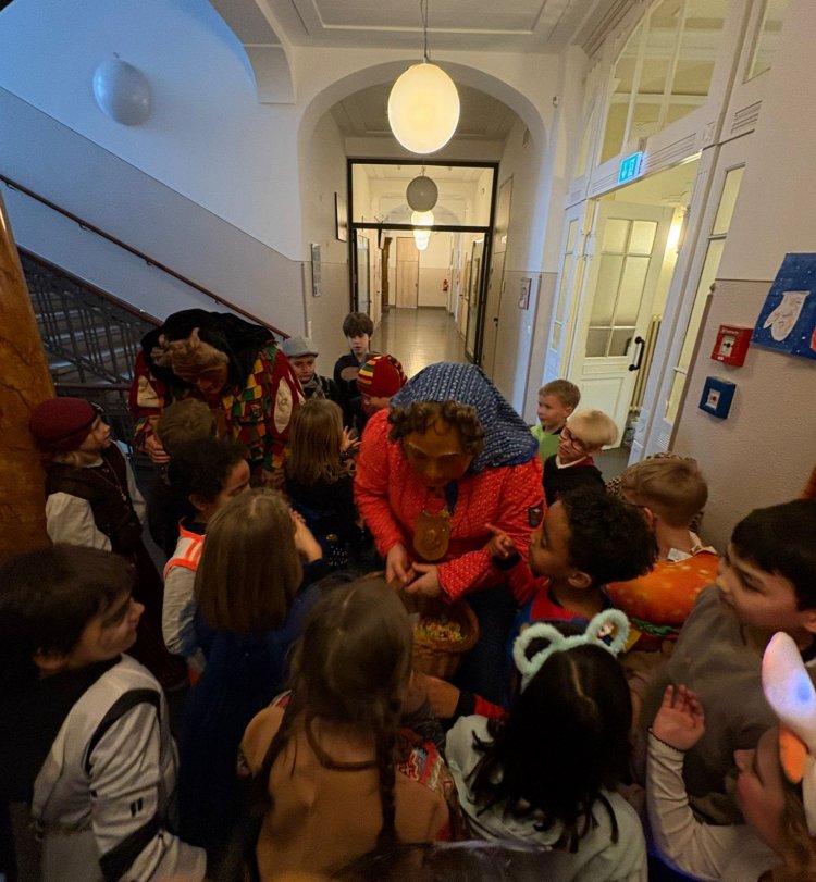 Es fing alles ganz harmlos an. Doch plötzlich setzte diese laute Musik ein, die in meinen winzigen Beinen kribbelte. Und dann passierte es: Eine riesige, bunte Schlange wälzte sich durch die Flure! Sie wurde von Klassenzimmer zu Klassenzimmer immer länger, bis sich eine endlose Kette aus Polizisten, Prinzessinnen und Dinosauriern auf mich zu bewegte. Ich habe mich vorsichtshalber an einer Fußleiste festgehalten, während die bunte Truppe an mir vorbeizog.