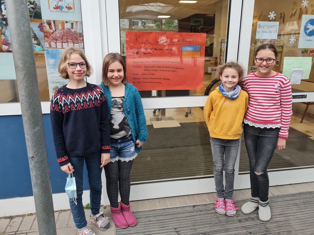 "Wir vier Mädels aus der Klasse 4B haben einen Kuchenverkauf im Wohngebiet gemacht. Wir haben erfolgreiche 640 € eingenommen. Das Geld spenden wir an Apotheken ohne Grenzen. 12 Kuchen und ein paar Bilder haben wir vollständig verkauft." (Shara, Tabea, Heike und Vanessa)