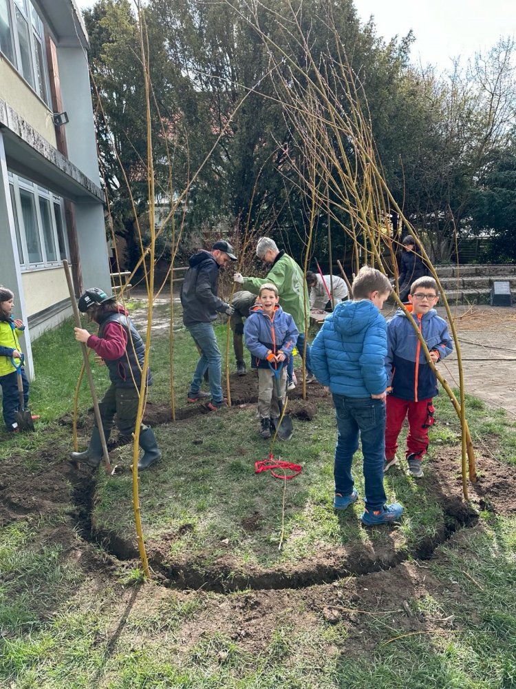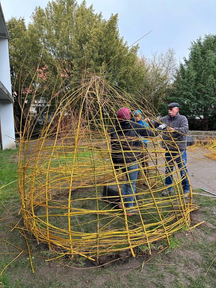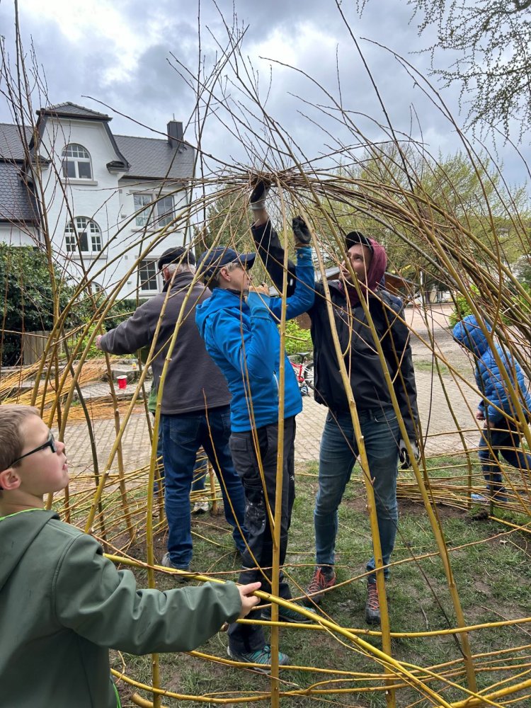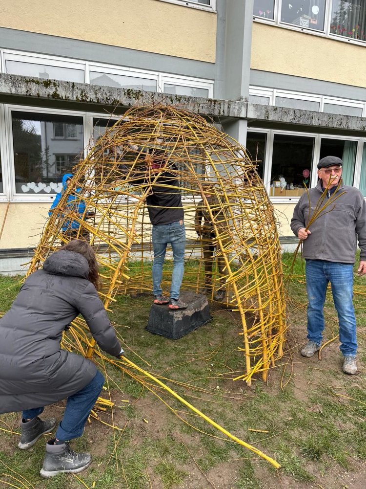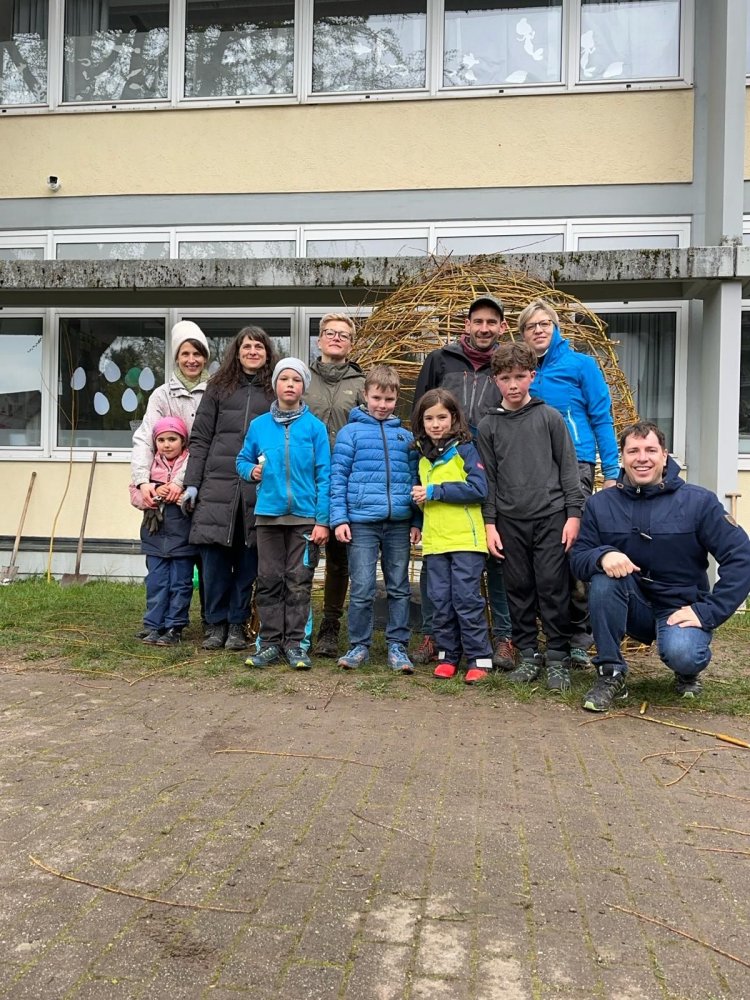 6 Familien sind dem Aufruf des Elternbeirats gefolgt und haben zu Ferienbeginn das schöne Weidentipi gebaut.