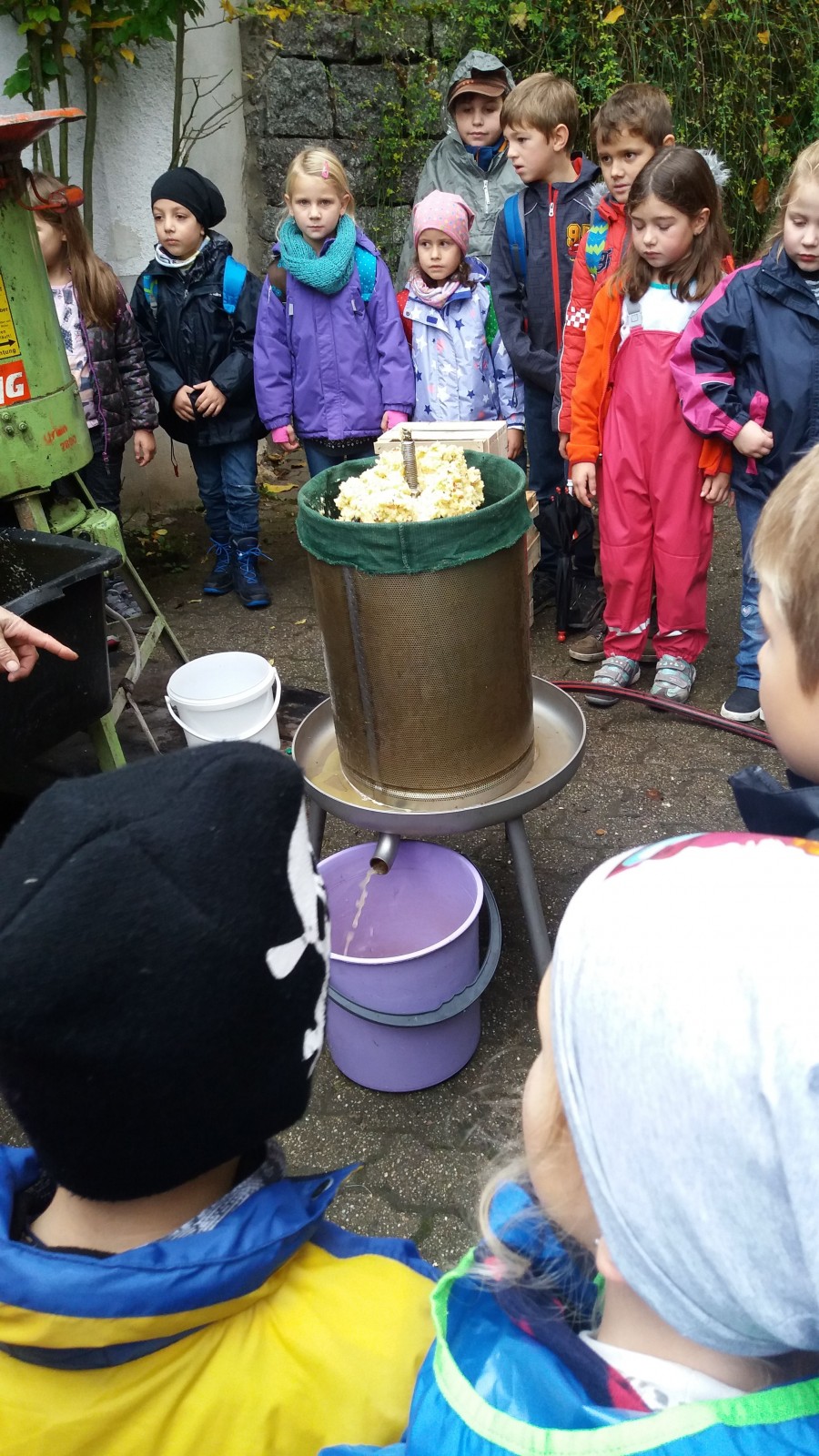 Vielfältig wurde das Thema Apfel im Unterricht fächerübergreifend erarbeitet. Ein besonderes Erlebnis war die gemeinsame Herbstwanderung, die zum Obsthof Heiberger führte. Dort wurden alle mit Brezeln sehr herzlich empfangen und durften miterleben, wie Apfelsaft gepresst wird, der auch gleich probiert wurde. Dank Frau Heiberger, durften alle Kinder außerdem die Äpfel für ihren Apfelkuchen kostenlos mitnehmen.