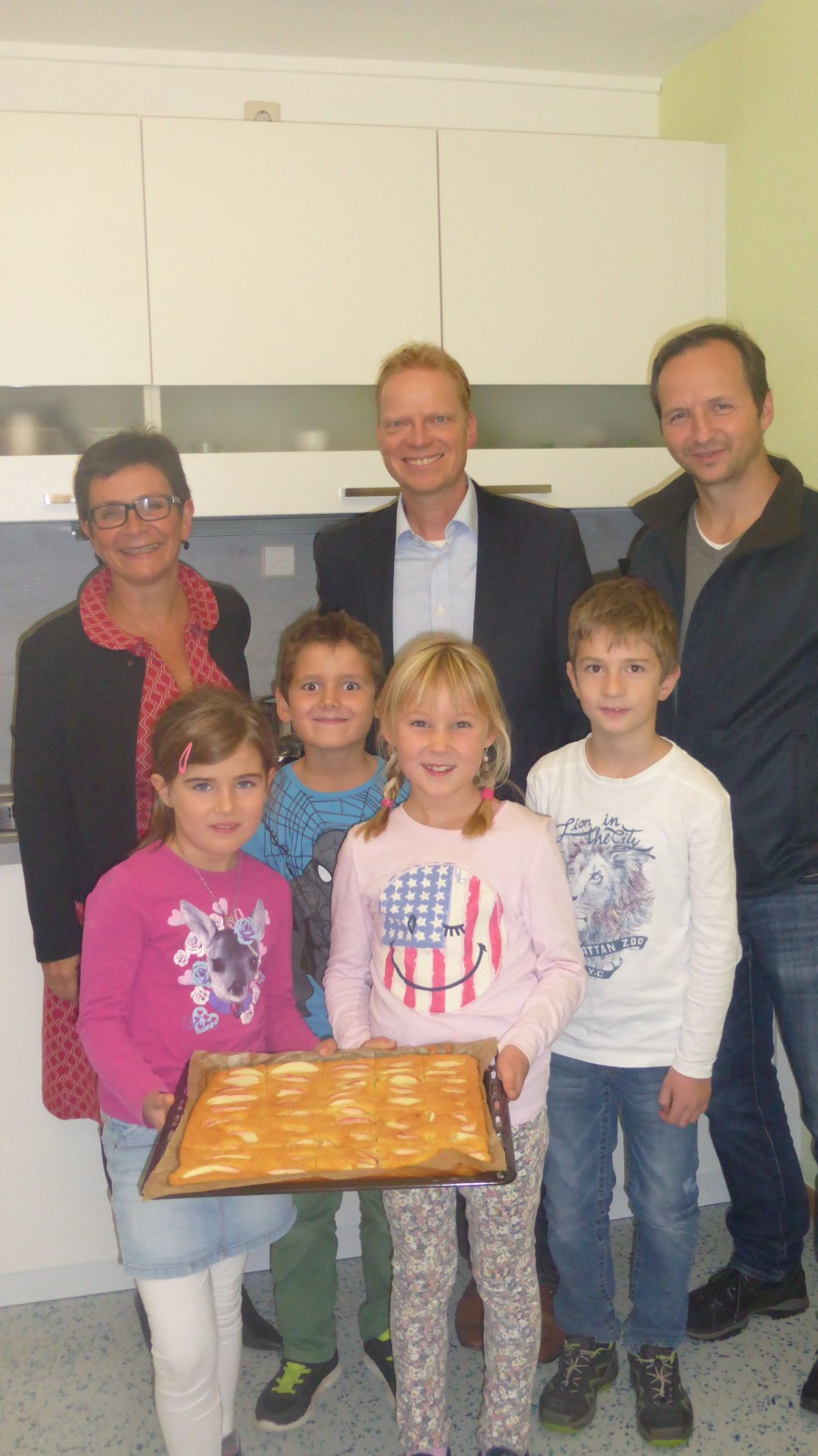 Mit dem Lied vom Apfel wurden Rektorin Eva Woelki, Ortsvorsteher Martin Benz und Herr Trayer vom Stadtbauamt in der Außenstelle der Grundschule in Tiergarten begrüßt. Sie ermöglichten die Umsetzung einer neuen Schulküche, die nun zahlreiche neu Unterrichtsaktivitäten eröffnet. Die Kinder der Klassen 1 und 2 feierten die Einweihung ihrer neuen Schulküche im Rahmen eines großen Apfelprojekts. Stolz wurde den Gästen der selbstgebackene Apfelkuchen präsentiert.