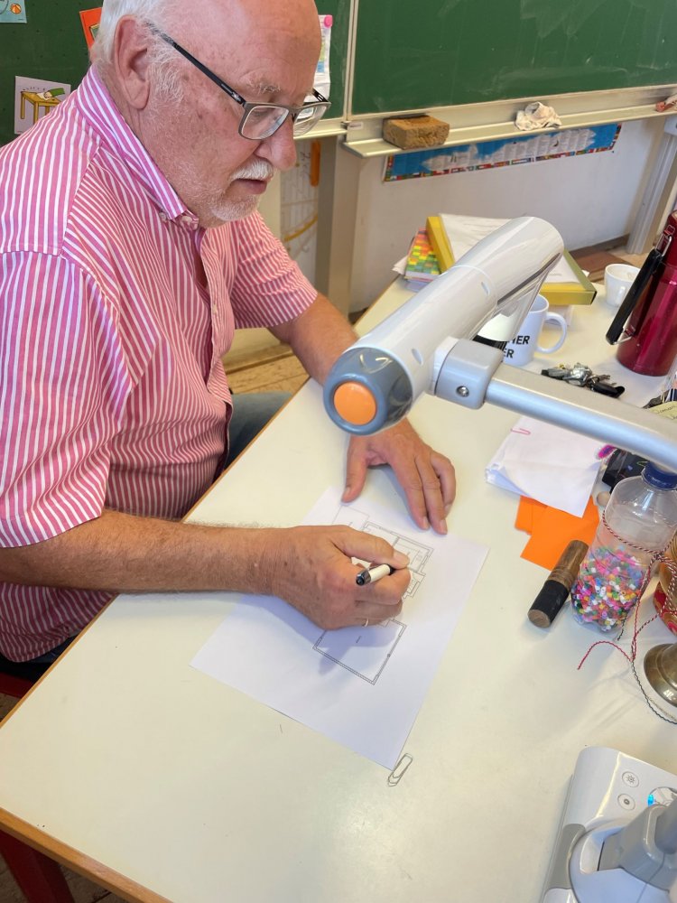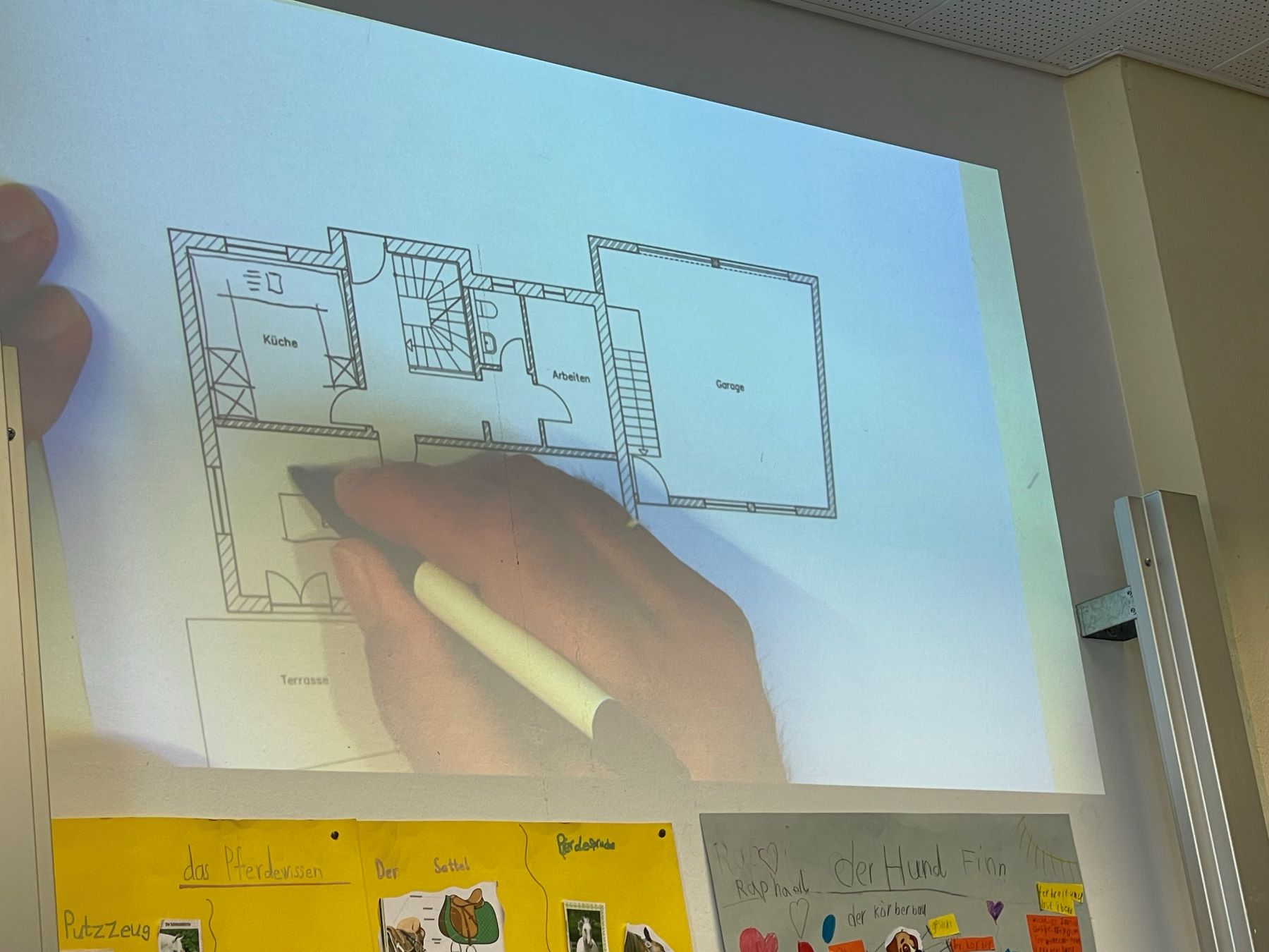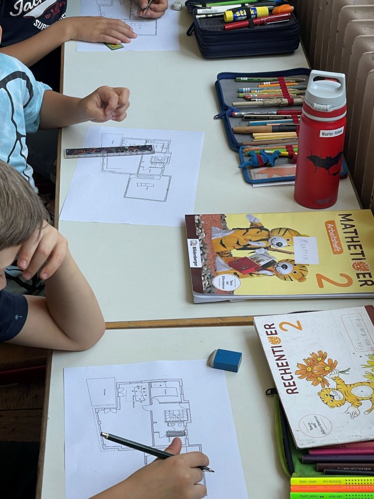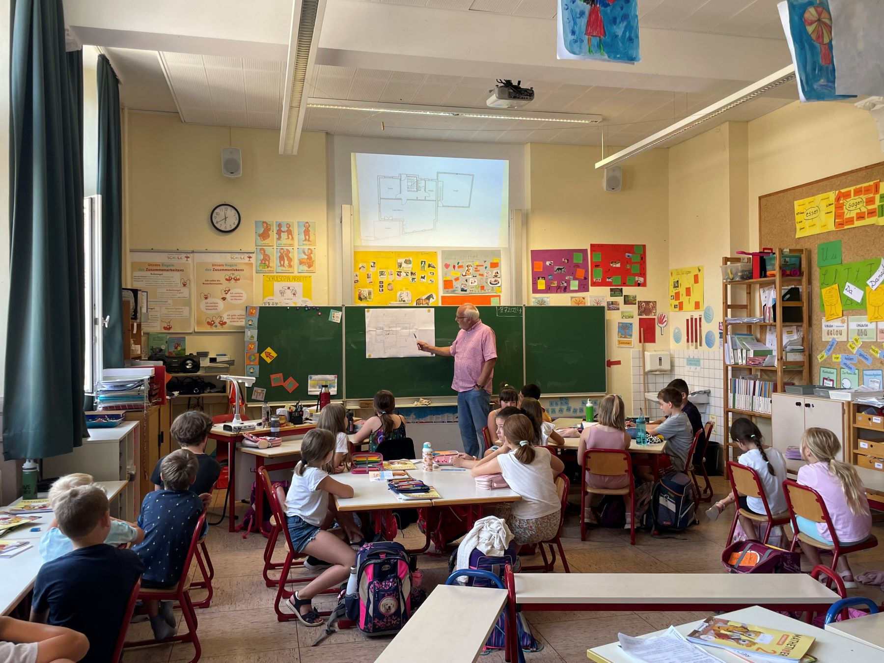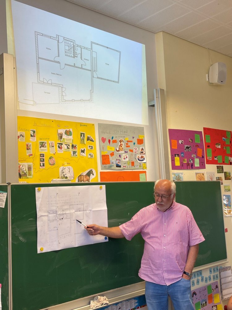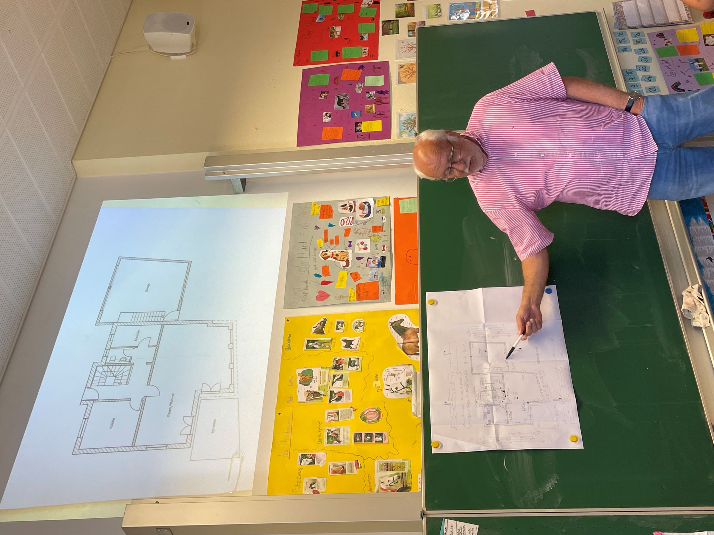 In Mathematik beschäftigte sich die Klasse 2b mit Bauplänen und glücklicherweise ist Jakobs Großvater Architekt! Er kam in die Klasse, um uns seinen Beruf zu erklären und uns den Bauplan eines Hauses zu zeigen, den er gezeichnet hatte. Der Opa brachte Pläne für die Kinder mit und diese konnten den Bauplan für ihr Traumhaus zeichnen. Die Kinder fanden diesen Austausch sehr interessant und der Opa konnte sein Klassenzimmer aus seiner Zeit in der Grundschule wiedersehen. WH