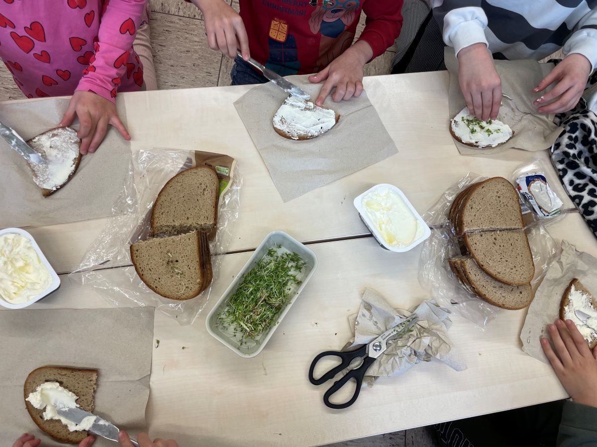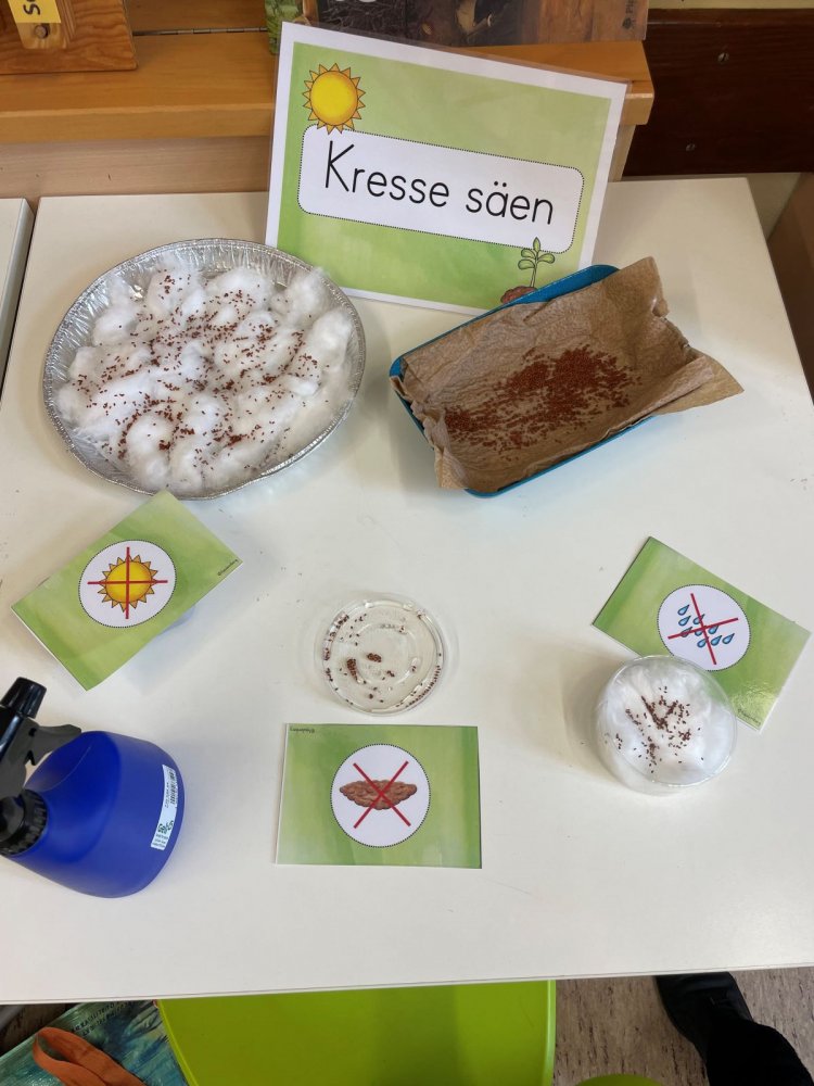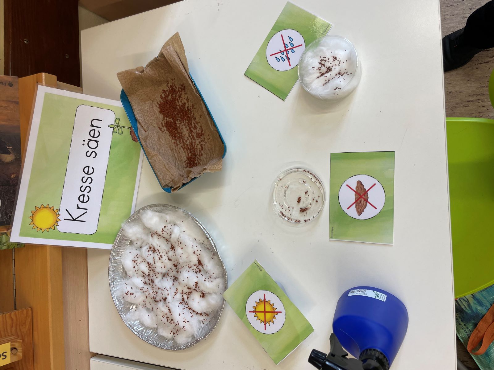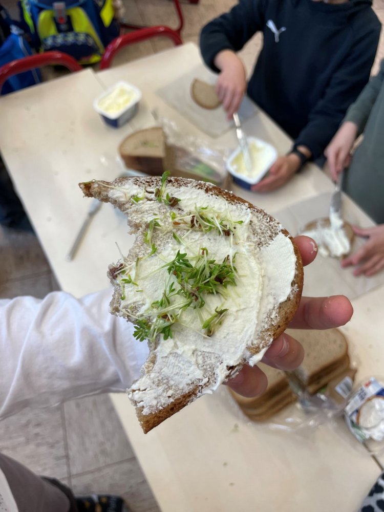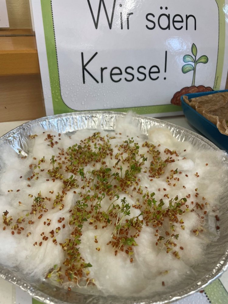 Wir, die 2b, haben im Sachunterricht Kresse gepflanzt. Wir haben es mit Experimenten versucht: Kresse ohne Wasser, ohne Licht oder auch ohne Erde (hier ohne Baumwolle) pflanzen, aber die Kresse hat es immer geschafft zu wachsen. Zum Schluss haben wir die Kresse auf Brot und Frischkäse probiert. Lecker! WH