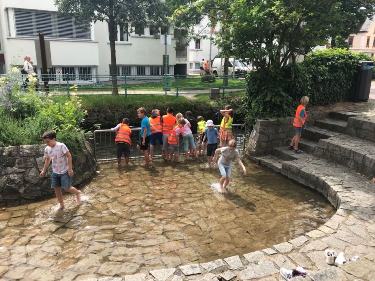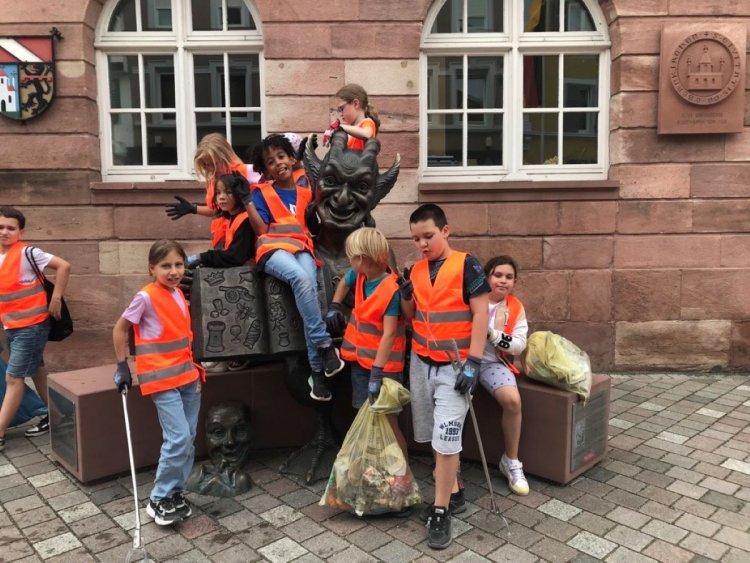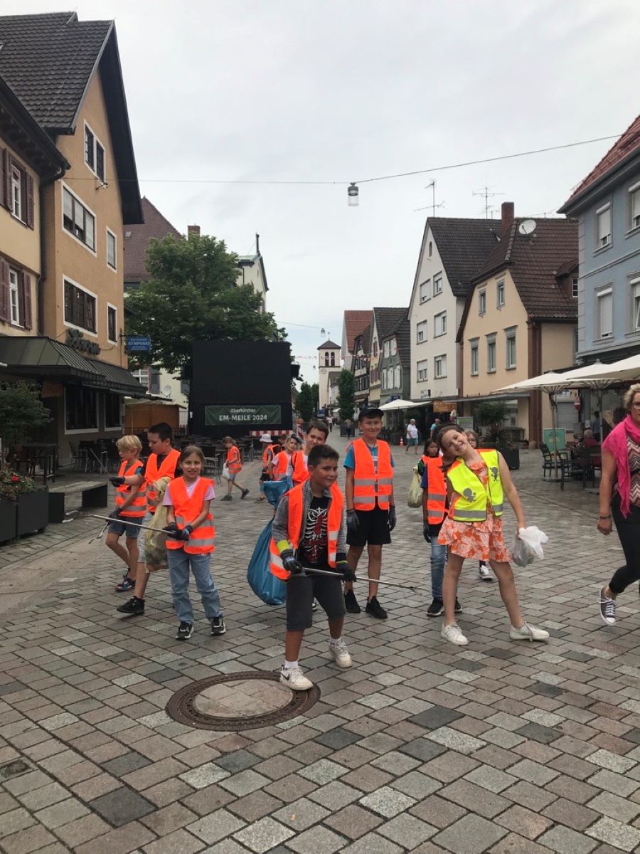 Nach der Liveübertragung des Deutschlandspiels in der Fußgängerzone räumen Kinder der JWS den restlichen Müll weg und kühlen sich am Bachschlenker ab .