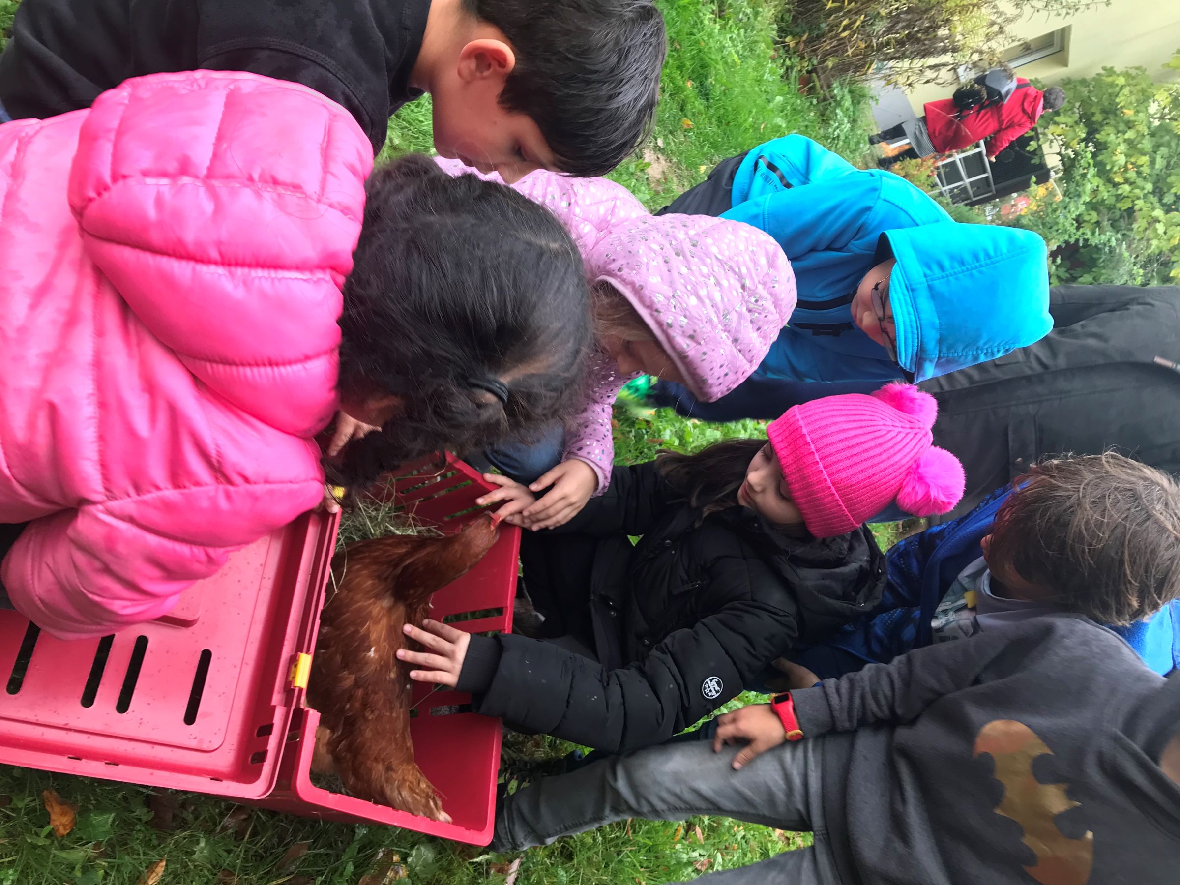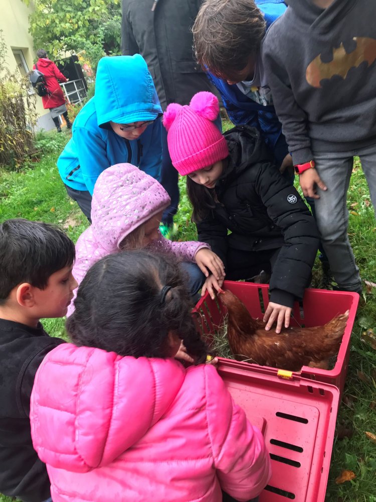 Die Erdschützer-Werkstatt zu Besuch bei glücklichen Hühnern