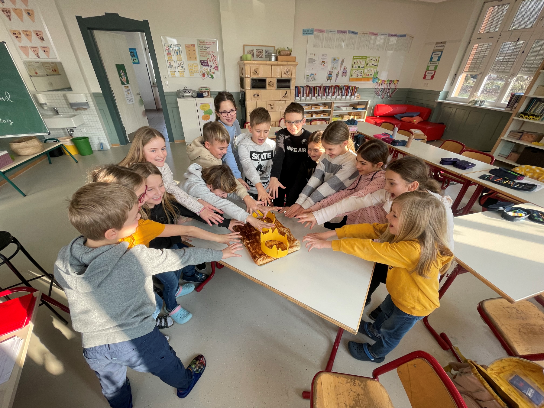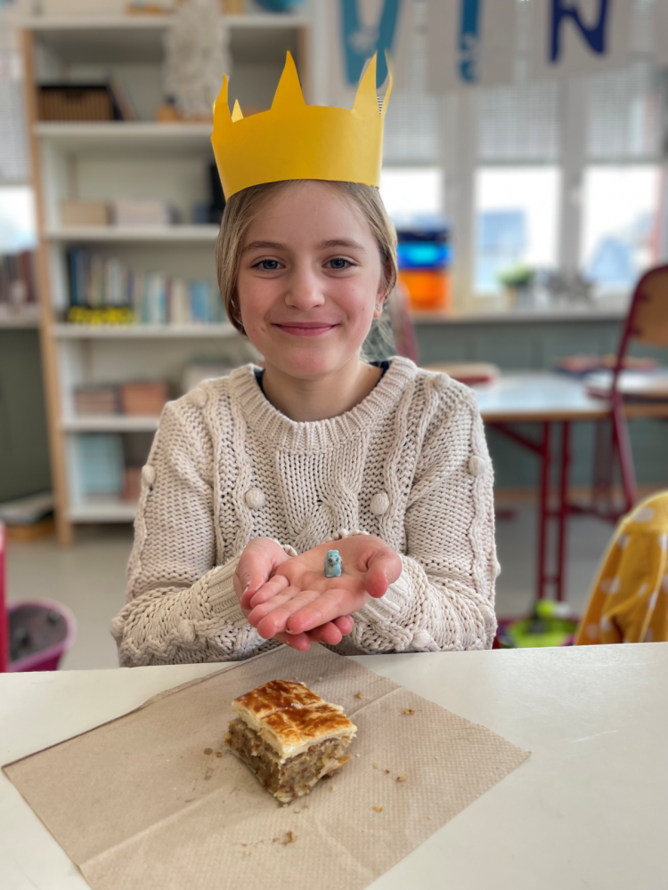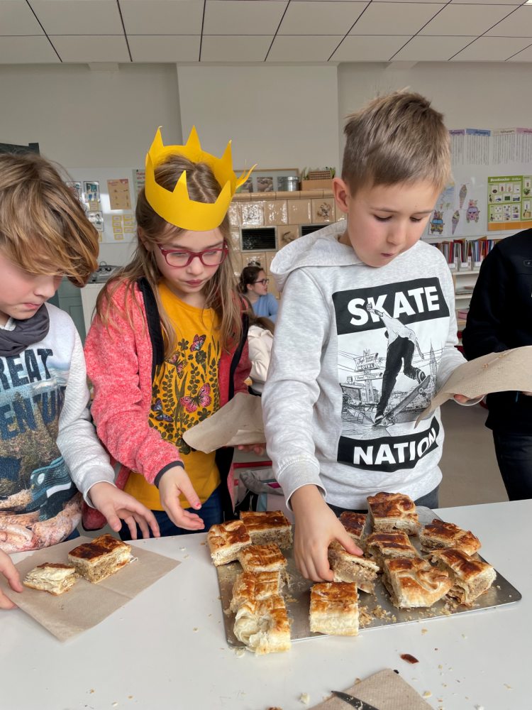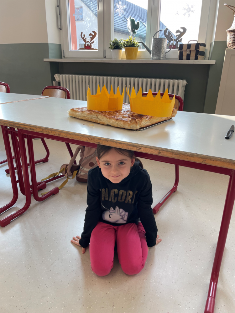 Am 6. Januar essen wir in Frankreich die Galette des rois (Dreikönigskuchen). Das ist ein Kuchen aus Mandeln, in dem eine Figur versteckt ist. Die jüngste Person stellt sich unter den Tisch und entscheidet über die Verteilung der Kuchenstücke. Derjenige, der die Figur findet, wird König oder Königin. Im Französischunterricht hat die 3. Klasse aus Haslach natürlich auch die Galette probiert. WH