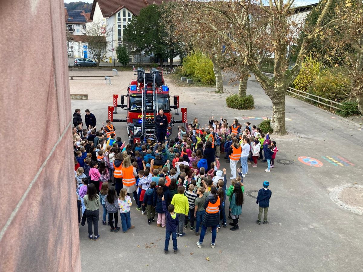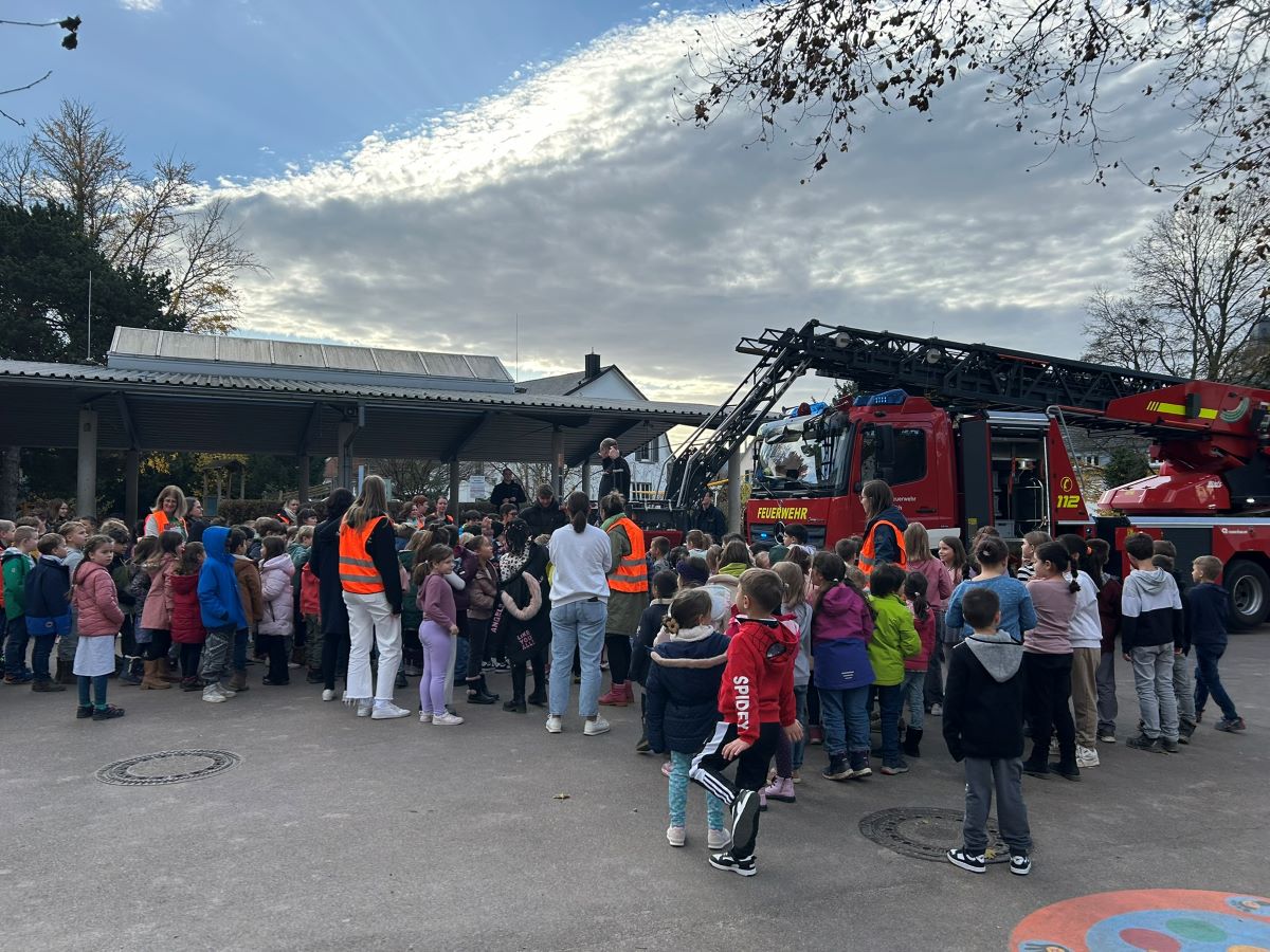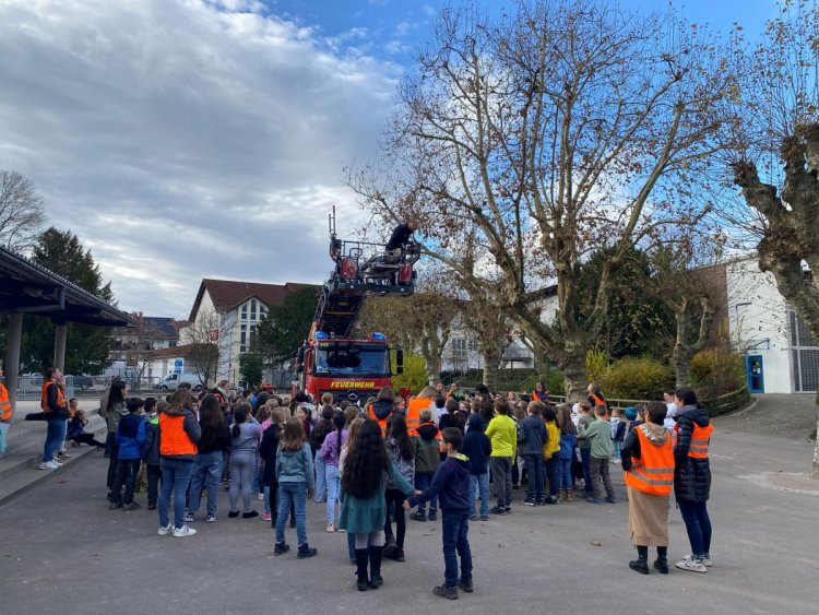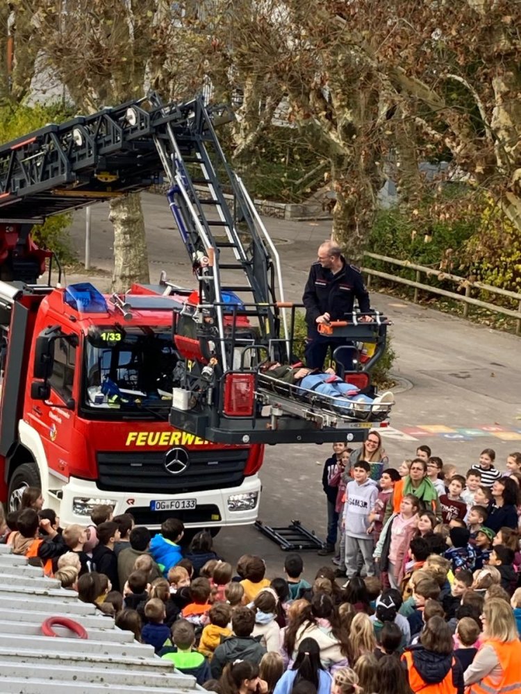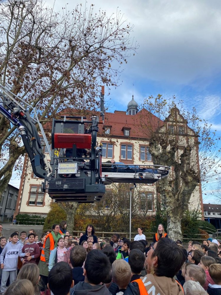 Die diesjährige Räumungsübung in der Kernstadt fand im November bei angenehm-milden Temperaturen statt. Nachdem der Feueralarm dafür sorgte, dass alle SchülerInnen zusammen mit ihren Lehrerinnen das Gebäude verließen, sammelten man sich entlang der Schwarzwaldstraße bis Schulleiterin Eva Woelki überprüft hatte, dass alle vollzählig waren. Anschließend ging es zurück auf den Schullof, wo es Lob von den eingetroffenen Feuerwerhmännern gab. In 2:43 Minuten war das gesamte Schulgebäude geräumt gewesen. Zur Freude der Kinder wurde unser Bufdi Lukas, angefeuert von großem Applaus, auf der Feuerwehrtrage der Drehleiter gen Himmel befördert und sicher wieder abgesetzt. Auch das Fahrzeug war zu besichtigen, bevor es zurück in die Klassenzimmer ging.