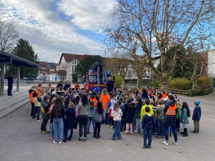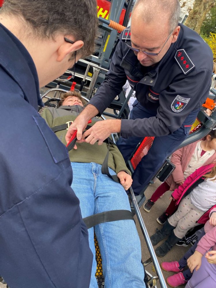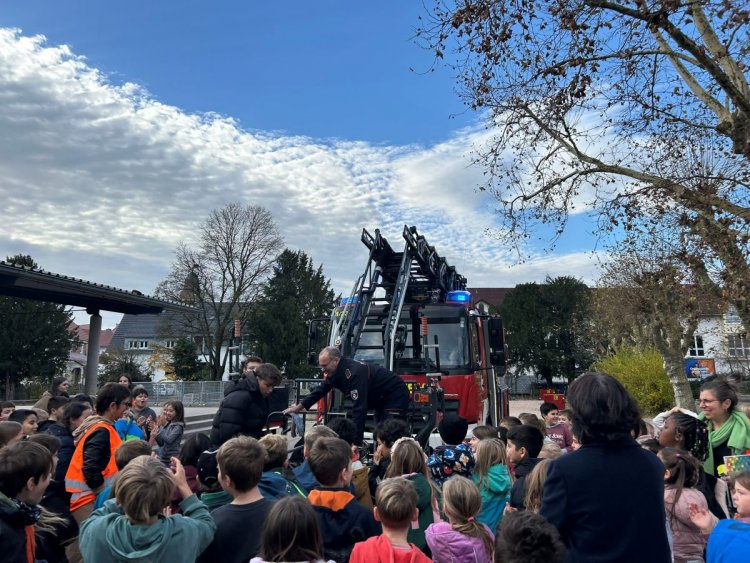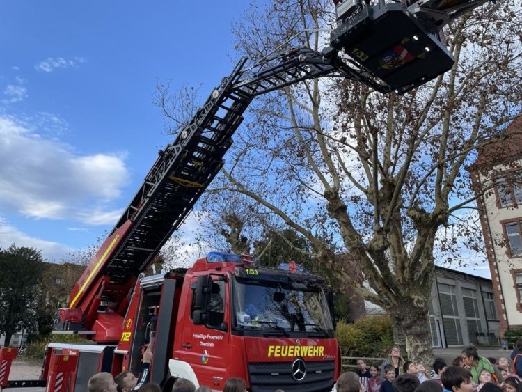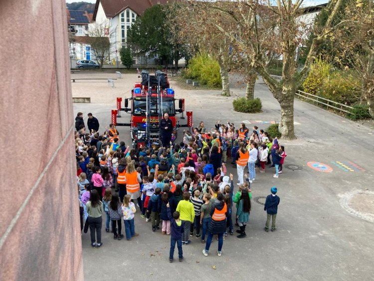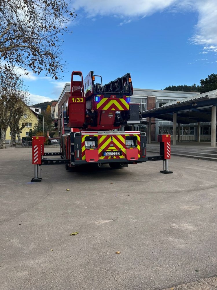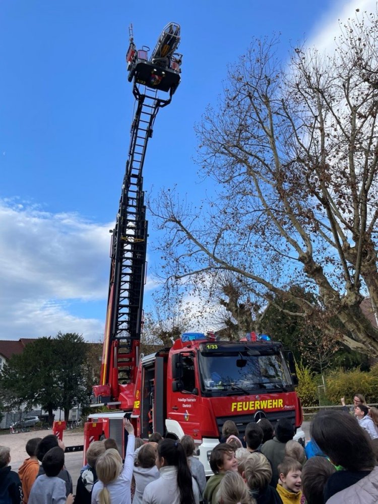 Die diesjährige Räumungsübung in der Kernstadt fand im November bei angenehm-milden Temperaturen statt. Nachdem der Feueralarm dafür sorgte, dass alle SchülerInnen zusammen mit ihren Lehrerinnen das Gebäude verließen, sammelten man sich entlang der Schwarzwaldstraße bis Schulleiterin Eva Woelki überprüft hatte, dass alle vollzählig waren. Anschließend ging es zurück auf den Schullof, wo es Lob von den eingetroffenen Feuerwerhmännern gab. In 2:43 Minuten war das gesamte Schulgebäude geräumt gewesen. Zur Freude der Kinder wurde unser Bufdi Lukas, angefeuert von großem Applaus, auf der Feuerwehrtrage der Drehleiter gen Himmel befördert und sicher wieder abgesetzt. Auch das Fahrzeug war zu besichtigen, bevor es zurück in die Klassenzimmer ging.